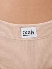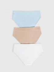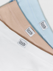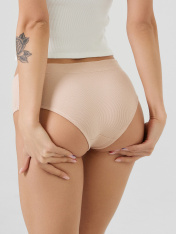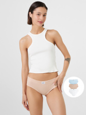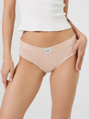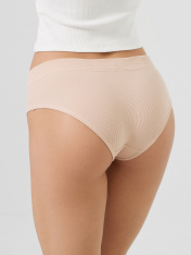 Трусы женские, средняя линия талии, силуэт - слипы. Передняя и задняя детали выполнены из рибаны. Верхний срез трусов обработан бейкой поперечной из рибаны, внутри жилка 6мм. Нижние срезы обработаны бейками поперечными из рибаны. Подкладка ластовицы из хлопка, отлетная по верхнему срезу.
