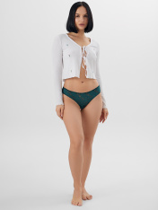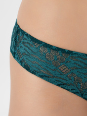 Трусы женские, средняя линия талии, силуэт - бразилиано. Передняя деталь выполнена из кружева. Ластовица из кружева на подкладке из хлопка. Задние детали выполнены из кружева. По верхнему срезу трусов жилка 6мм. По нижним срезам передней детали жилка. На передней детали декоративные обтачки из ткани.