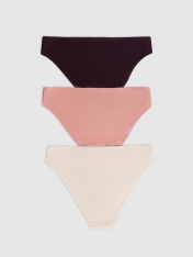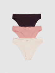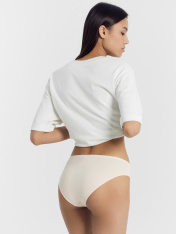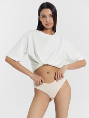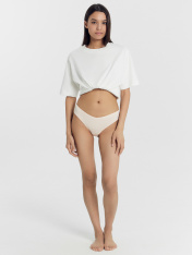 Трусы женские со средней линией талии силуэта «слип» из трикотажного полотна -рибана 2*2. Передняя и задняя детали цельные. Ластовица из кулирной глади отлетная по переднему срезу. Верхний срез по передней детали имеет V-образный вид. Талия обработана швом вподгибку на п/ш машине с эластичной тесьмой внутри. Ножки обработаны швом вподгибку на п/ш машине с эластичной тесьмой внутри.