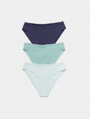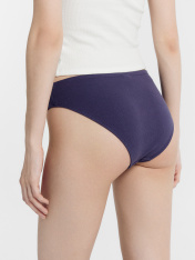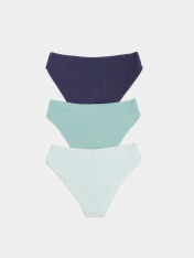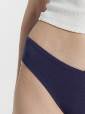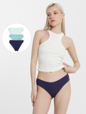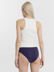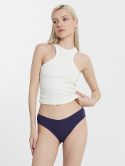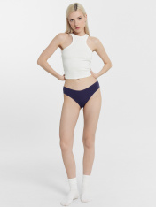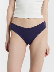 Трусы женские со средней линией талии силуэта «слип» из трикотажного полотна -рибана 2*2. Передняя и задняя детали цельные. Ластовица из кулирной глади отлетная по переднему срезу. Верхний срез по передней детали имеет V-образный вид. Талия обработана швом вподгибку на п/ш машине с эластичной тесьмой внутри. Ножки обработаны швом вподгибку на п/ш машине с эластичной тесьмой внутри.