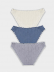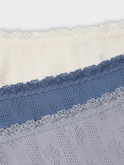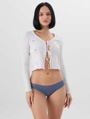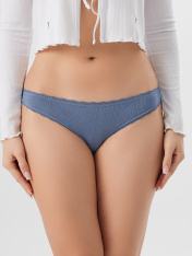 Трусы женские слипы с низкой посадкой из мелкараппортной рибаны._x000D_ Передняя деталь цельная. Ластовица отлетная по переднему срезу, выполнена из кулирного полотна. Нижние и верхний срезы обработаны узким кружевом 15мм на плоскошовной машине. По верхнему срезу с изнаночной стороне эл. тесьма 6мм (жилка wt4-6, девсел 13460w).