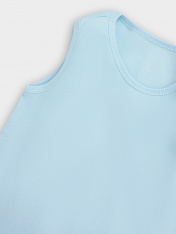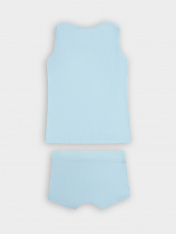 Комплект состоит из майки и трусов. Майка прилегающего силуэта без рукавов из полотна трикотажного рибаны. Длина до середины бедер. Горловина круглая. Проймы и горловина окантованы бейкой из основного полотна. Низ изделия обработан на 2х игольной плоскошовной машине. Трусы прилегающие, без боковых швов выполнены из полотна трикотажного рибаны. Пояс отрезной из трикотажного кулирного полотна с внутренней эластичной тесьмой. Шаговый шов и боковые швы гульфика выполнены строчкой "флэт-лок". Подкладка гульфика из трикотажного кулирного полотна. Нижние срезы трусов застрочены в подгибку.