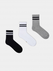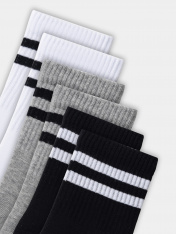 Носки детские из высококачественного хлопка с высокой резинкой и рисунком в виде поперечных полосок мультипак (3 пары). Натуральные волокна отлично пропускают воздух и впитывают влагу, дарят ощущение комфорта в течение дня. Благодаря небольшому количеству эластана в составе, носки удобно сидят на ножке и не сползают, хорошо тянутся и легко надеваются. Пятка и мысок дополнительно укреплены для защиты от протирания. Резинка мягко, но надежно удерживает носки, не оставляя на коже следов. Этот набор детских носков точно понравится вашей маленькой моднице. Рекомендуем!