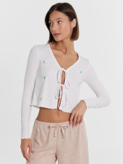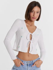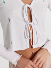 Романтичный женский джемпер прилегающего силуэта в белом цвете с вышивкой в виде цветочков. Горловина V-образной формы. Спереди есть милые завязки. Рукав длинный, низ волнистый. В составе изделия - мягкая вискоза. Материал, из которого изготовлен джемпер, приятный на ощупь и обладает отличной воздухопроницаемостью, позволяя коже дышать. Кофточка (джемпер) легко комбинируется с различными элементами гардероба, такими как классические брюки, однотонные юбки или джинсовые шорты. Станет отличным выбором как для повседневной носки, так и для более торжественных случаев, когда нужно выглядеть модно. Широкий размерный ряд. Рекомендуем!