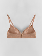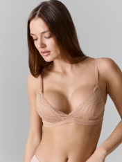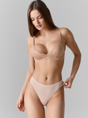 Бюстгальтер женский, t-shirt. С жесткими формованными чашками, без каркасов. Чашки обтянуты кружевом. Бочки из кружевного полотна. По верхнему срезу бочка и пройме тесьма жесткая без зуба. В бок чашки вставлены пластины. Нижний срез обработан бейкойиз кружевного полотна с тесьмой. Бретели (по размерам). Застежка.