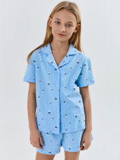Комплект состоит из рубашки и шорт. Рубашка прямого силуэта, с отложным воротником, спинка цельнокроеная. Плечо слегка спущено. Рукав втачной, одношовный, короткий. Центральная застежка на пуговицы._x000D_ Шорты слегка расширены к низу. Пояс цельнокроеныйс эластичной тесьмой внутри. Низ застрочен швом в подгибку.