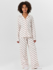 Комплект состоит из рубашки и брюк. Рубашка прямого силуэта, с отложным воротником, спинка цельнокроеная._x000D_ Плечо слегка спущено. Рукав втачной, одношовный, длинный. Центральная застежка на пуговицы d= 10 mm._x000D_ Брюки слегка расширены к низу. Пояс цельнокроеный с эластичной тесьмой внутри Rv35._x000D_ Низ застрочен швом в подгибку.