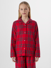 Комплект для девочек состоит из рубашки и брюк. _x000D_ Рубашка прямого силуэта, с отложным воротником, спинка цельнокроеная._x000D_ Рукав втачной, одношовный, длинный. _x000D_ Центральная застежка переда на пуговицах (4шт) d= 10 mm. Брюки свободные, прямые со средним швом и боковыми. _x000D_ Пояс цельнокроеный с эластичной тесьмой внутри (внутрення резина 30RV), ширина 30 мм._x000D_ Низ рубашки и брюк обработан на 2-х игольной плоскошовной машине швом в подгибку._x000D_