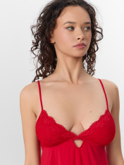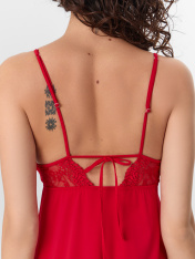 Сорочка женская, прилегающего силуэта. Вырез горловины V-образный. Верхний срез чашки обработан тесьмой. Верх лифа выполнен из кружева, низ из эластичного полотна микрофибра. Проймы обработаны бейкой в 4 сложения, с силиконовой лентой внутри шир.4мм, образующую бретель с регулировкой MPW808 . Сорочка с подрезом под грудью, с жесткой тесьмой WTWE1-8. На детали переда, под грудью разрез. По срезу спинки отделка из кружева и декоративный вырез с бейками на завязках. Низ изделия обработан на микрооверлоке.