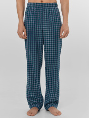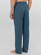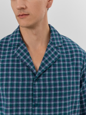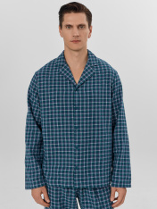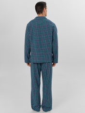 Мужской домашний комплект в классическую клетку станет идеальным спутником для отдыха. Пижама, состоящая из рубашки и брюк, выполнена из хлопка, который дарит коже приятные ощущения и обеспечивает комфорт весь день. Свободная рубашка прямого силуэтас V-образным вырезом и отложным воротником выглядит элегантно и не сковывает движений. Длинные рукава со спущенным плечом и аккуратно обработанными манжетами дополняют образ. Прямые брюки с удобным цельнокроеным поясом на эластичной тесьме мягко сидят по фигуре. Практичные боковые карманы и аккуратная обработка низа подчеркивают качество исполнения.<br>_x000D_ <br>_x000D_ Доминантой дизайна выступает стильная клетка, а тонкое сочетание с полоской придает комплекту особый шарм и визуальную глубину. Мягкая дышащая ткань обеспечивает идеальный микроклимат, делая этот комплект прекрасным выбором для расслабленного вечера или полноценного ночного отдыха в прохладный сезон.