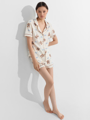 Хлопковый женский комплект актуального свободного силуэта. Рубашка прямая, с отложным воротником и лацканами, короткими рукавами, застегивается на пуговицы. Дополняют ее свободные шорты длины мини, с резиновой тесьмой в поясе и атласной тесьмой, которая завязывается на бантик. Особенность модели – контрастные канты на рукавах, воротнике и передней части рубашки. Рекомендуем для сна, отдыха и домашних дел!