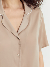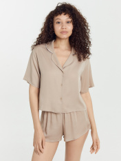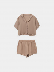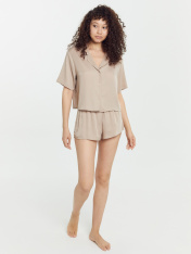 Стильный комплект женский состоит из жакета и шорт. Выполнен из высококачественного материала. Жакет свободного силуэта, спинка цельнокроеная. Горловина оформлена отложным воротником с лацканами. Край воротника оформлен атласным кантом. Рукав втачной, короткий. Жакет с центральной застежкой с петлями и пуговицами. Мини-шорты свободного силуэта. Красивая модель для сна, отдыха и домашних дел. Рекомендуем для модных домашних образов!