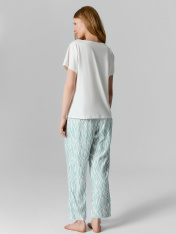 Домашний комплект с принтом — это воплощение нежности и весеннего настроения для отдыха. Он состоит из свободной футболки и прямых бриджей, выполненных из мягкой смесовой ткани, которая дарит коже ощущение шелковистой мягкости и лёгкости._x000D_ <br>Футболка с V-образным вырезом, украшенным кружевом, и короткими рукавами создаёт расслабленный, женственный образ. Бриджи с поясом на эластичной резинке и декоративным шнурком обеспечивают удобную посадку, а атласный кант по низу добавляет изящную завершающую деталь. Нежный цветочный принт наполняет образ романтичностью и свежестью.<br>_x000D_ <br>_x000D_ Состав из вискозы, хлопка и модала обеспечивает идеальный баланс: ткань прекрасно дышит, мягко облегает фигуру и сохраняет свои свойства после стирок. _x000D_ <br>Этот комплект станет вашим любимым спутником для спокойных дней дома, создавая атмосферу уюта, гармонии и заботы о себе