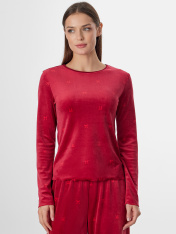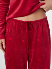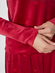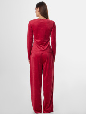 Домашняя пижама из велюра подарит вам ощущение уюта и мягкости. Этот уютный ансамбль состоит из джемпера полуприлегающего силуэта и свободных брюк, созданных для полного расслабления._x000D_ Джемпер с круглым вырезом и длинными рукавами мягко облегает фигуру, не стесняя движений. Брюки со средней посадкой на мягком эластичном поясе обеспечивают комфорт и удобную посадку. Два вместительных кармана в боковых швах с мягкой подкладкой внутри добавляют модели практичности.<br>_x000D_ <br>_x000D_ Роскошный велюр с бархатистой поверхностью нежно касается кожи, даря приятные тактильные ощущения и мягкое тепло. Состав на основе полиэстера с небольшой добавкой эластана делает материал прочным, он отлично сохраняет форму после множества стирок. <br>_x000D_ <br>_x000D_ Этот комплект станет вашим любимым выбором для спокойных вечеров, утра в выходной день или моментов отдыха с чашкой горячего напитка. Насыщенный цвет добавляет образу яркости и ощущение праздника даже в обычной домашней обстановке._x000D_