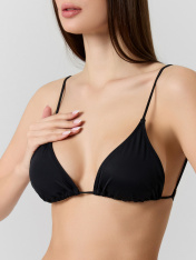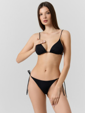 Бюстгальтер купальный с треугольными чашками. Чашки на подкладке, со съемными чашками-вкладышами (Fnv-20). К верхнему углу чашки крепится бретель-завязка. По нижнему краю в сгиб чашки протянута завязка. Трусы купальные бразилиана со средней линией талии из гладкой микрофибры. Передняя и задняя детали цельные. Передняя деталь на подкладке. Верхние и нижние срезы обработаны швом вподгибку с эластичной резиной 7 мм внутри. На бочках протяжки-завязки из основного полотна.