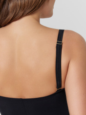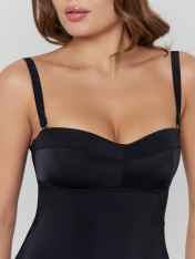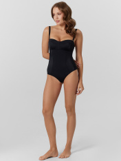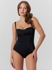 Купальник женский слитный со съемными бретелями. Перед на подкладке, с вертикальными рельефами, и горизонтальным подрезом под грудью. Чашки с декоративным горизонтальным членением. Чашки на подкладке из дубляжа. В бочках на ровне дубляжа настрочена каркасная тесьма с пластинами. По нижнему срезу дубляжа с изнаночной стороны настрочена эл тесьма 10 мм (жесткая без/зуба, девсел 487W). Спинка со средним швом. Верхний срез обработана швом вподгибку с эластичной резиновой тесьмой 10 мм внутри. Нижние срезы купальника обработаны швом вподгибку с эластичной резиновой тесьмой 7 мм внутри. Съемные бретели с регулировкой по длине 15 мм с резиновой эл тесьмой внутри. Регуляторы и застежки-крючки 15 мм металлические с гальваническим покрытием (2 Рамки 15 мм, 4 крючка 15 мм).