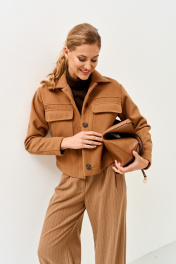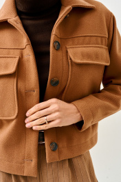 Жакет женский на подкладке с центральной бортовой застежкой на петли, пуговицы. Воротник стояче отложной. Рукав втачной двухшовный. Детали переда и спинки с кокетками. На деталях переда обработаны накладные карманы с клапанами.