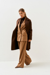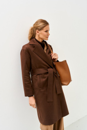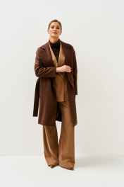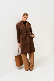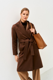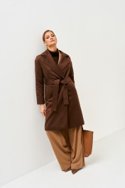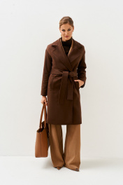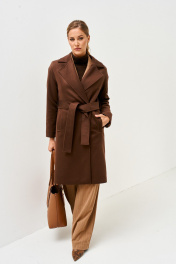 Пальто женское прямого силуэта на подкладке, со смещенной бортовой застежкой на петли и пуговицы, с отложным воротником и спущенным ркуавом. На деталях переда обработаны боковые прорезные карманы с листочкой. Спинка разрезная. Пояс сьемный.