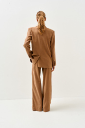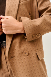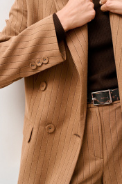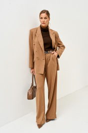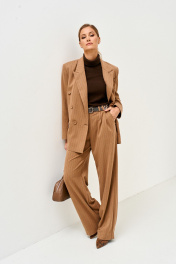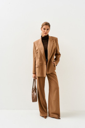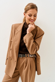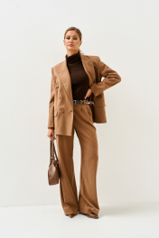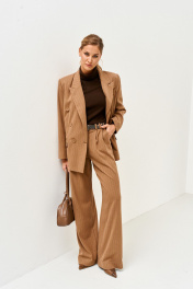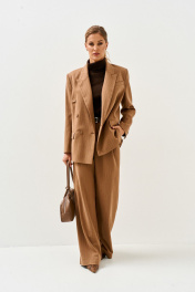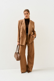 Жакет женский полуприлегающего силуэта на подкладке со смещенной бортовой застежкой на петли, пуговицы. Воротник пиджачного типа. Рукав втачной двухшовный с имитацией шлицы и отделочными пуговицами. На деталях переда обработаны прорезные карманы с клапаном и двумя обтачками, на левой полочке обработан верхний прорезной карман с листочкой. Спинка со средним швом и шлицей.