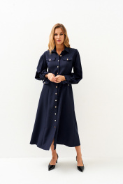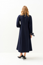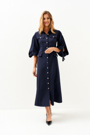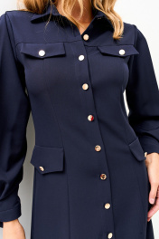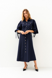 Платье женское прилегающего силуэта с центральной бортовой застежкой на петли, пуговицы с отложным воротником.Рукав втачной, одношовный со складками переходящими в разрезы,по низу рукава притачная манжета переходящая в завязки.На деталях переда обработаны карманы с клапанами (нефункциональные) . Перед и спинка с кокеткамии и вертикальными рельефами.