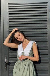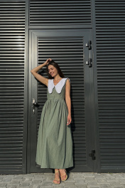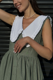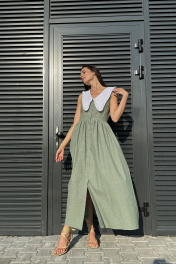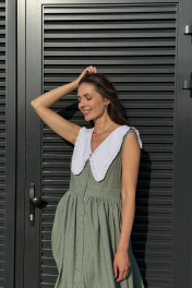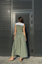 Притягательное платье умеренного объема приталенного силуэта, отрезного по талии. На верхней части полочки нагрудные вытачки. На верхней части спинки талиевые вытачки. Нижняя часть платья объемная. Объем создан за счет сборки на юбке. Вырез горловины глубокий V-образной формы. Воротник отложной, декоротивный, сьемный. Застежка платья центральная на петли и пуговицы. Ткань идет вареный хлопок-называется так, потому что прошла обработку горячей водой(энзимную стирку). Благодаря энзимной стирке на ткани образуется легкий неравномерный краш - эффект Длина юбки от талии 95 см. Длина по спинке 134 см.
