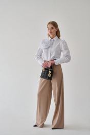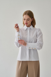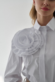 Блузка из хлопка - стиль, элегантность и комфорт в одном исполнении. Прямой силуэт, вытачки по груди, классический отложной воротник на стойке, потайная застёжка на петли и пуговицы по переду - все эти детали делают блузу универсальной и отвечающей всем требованиям дресс-кода. Разбавляет строгость и добавляет женственности длинный и объёмный втачной рукав со сборкой по низу и окату. Акцентные детали - это широкая притачная манжета, застёгивающаяся на три пуговицы со втачной оборкой по низу, а также оригинальный съёмный аксессуар в виде розы, которые добавляют образу нотку романтичности. Натуральность состава ткани обеспечит воздухопроницаемость и гигроскопичность и подарит комфорт и лёгкость. Рекомендации по уходу - на этикетке. Размеры соответствуют стандартной размерной сетке. Длина рукава с учетом манжеты 63см. Длина по спинке 58см.