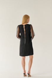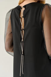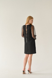 То самое маленькое чёрное платье, которое должно быть в гардеробе каждой девушки, женщины. Универсальный прямой крой и втачной рукав с небольшой сборкой по окату обеспечат свободу движений, нагрудные вытачки и круглый вырез горловины подчеркнут достоинства фигуры. Нежности и невесомости образу добавляют длинные рукава из органзы на манжете. А фактурная ткань атласного переплетения и шнуровка по спинке декоративным сияющим шнуром делает платье роскошным. По желанию можно расслабить или сильнее затянуть шнур, тем самым отрегулировать степень открытости спинки. Деликатная ткань не выгорает, не пилингуется, при этом тактильно приятна и очень комфортна в носке. Нарядное платье из новой коллекции не оставит равнодушным никого. Оно создано специально для неотразимого образа на важном мероприятии. Рекомендации по уходу - на этикетке. Размеры соответствуют стандартной размерной сетке. Дополнительные замеры: Длина рукава 57см. Длина по спинке от верхней точки плеча 95см.