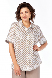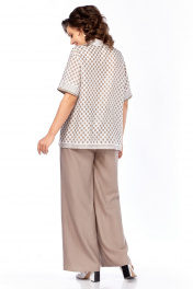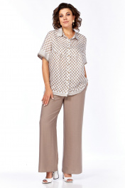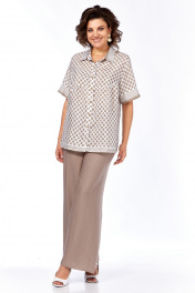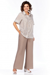 Комплект женский 2-х предметный, состоящий из блузки и брюк. Блузка прямого силуэта, с центральной застежкой, с планками на петли-пуговицы. Полочка с закругленными кокетками. Нижняя деталь полочки слегка присобрана по шву притачивания кокетки. Воротник рубашечный с отрезной стойкой. Рукав втачной, с манжетами застегивающимися на пуговицы. Брюки женские, широкие от бедра. По верху брюк притачной пояс с застежкой на пуговицу и молнию. По спинке брюк вставлена резинка. Имеются карманы в боковых швах.