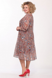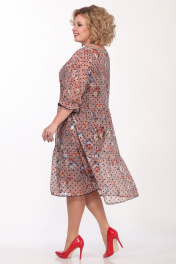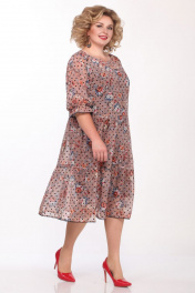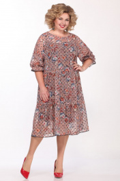 Комплект женский состоит из платья и платья-чехла на бретелях. Верхнее платье из шифона с рисунком, без застежки. Вырез горловины круглый, обработан косой бейкой. Полочка и спинка отрезные выше линии талии, с двумя присборенными воланами снизу. Линия плеча спущена, рукав на 5 см от низа присобран на узкую резинку. Длина платья по спинке 107,5см, длина рукава 31см, ширина рукава на уровне глубины проймы 50-47см, 52-48см, 54-49см, 56-50см. Платье-чехол выполнено из трикотажного полотна. Длина бретелей регулируется. Длина по спинке 81см. Реальные замеры верхнего платья 50 ог-108см, от-108см, 52 ог-112см, от-112см, 54 ог-116см, от-116см, 56 ог-120см, от-120см. Платье-чехол 50 ог-98см, об-104см, 52 ог-102см, об-108см, 54 ог-106см, об-112см, 56 ог-110см, об-116см.