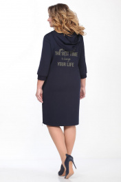 Платье женское прямого силуэта с капюшоном. Застежка молния по центру переда (16 см).Прорезной карман с молнией и накладной карман из отделочной ткани. Рукав втачной, низ рукава на манжете. На правом рукаве накладной карман. По карманам настрачивается декоративная тесьма. Спинка с декоративной печатью. В боковых швах разрезы,застегивающиеся на молнию. Длина по спинке 100см, длина рукава 45см, ширина рукава на уровне глубины проймы 52-36см, 54-37см, 56-38см. Реальные параметры платья 52 ог-110см, от-112см, об-120см, 54 ог-114см, от-116см, об-124см, 56 ог-118см, от-120см, об-128см.