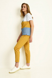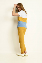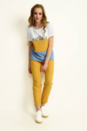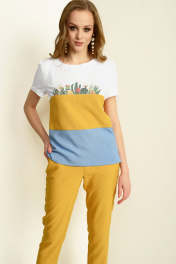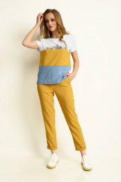 Блуза прямого силуэта, с втачным коротким рукавом с манжетой. Полочка и спинка с горизонтальными подрезами комбинированными по тканям и цветам. Полочка с принтом на кокетке. По боковым швам внизу разрезы. Брюки на притачном поясе по переду с застежкой, а по спинке на резинке, длинной 7/8, с отложной манжетой по низу.