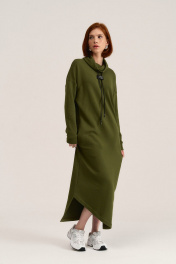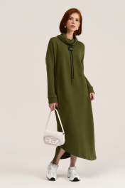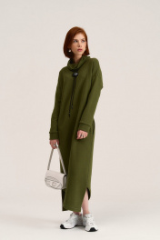 Платье свободного силуэта длиной макси, выполено из трикотажного полотна футер 3-х нитка петля/диагональ. Вырез горловины овальной формы с мягкой стойкой и декаротивным шнуром, который закреплен на дизайнерской нашивке. Линия плеча спущенная, длинные втачные рукава с манжетом по низу. В боковых швах обработаны карманы. Низ платья фигурной формы с разрезами. Теплое свободное платье - базовая вещь в любом гардеробе.