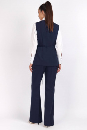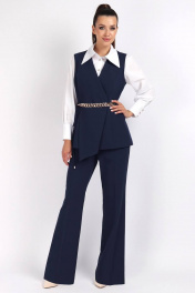 Костюм женский состоит из блузки, жилета и брюк. Жилет полуприлегающего силуэта с асимметричным отложным краем борта, с застёжкой на потайную пуговицу. По линии талии завязывающийся пояс с декоративной цепочкой. Брюки классической посадки, к низу расширенные от колена. На поясе декоративное украшение в виде цепочки. Застежка в брюках на спинке на потайную тесьму молния. Длина жилета по спинке 68 см, длина брюк по боковому шву с поясом 107 см ( р-р 46,48,50). В размерах 52, 54 на 1 см длиннее. Блузка полуприлегающего силуэта с застёжкой на петли и пуговицы. По горловине отложной воротник на отрезной стойке. Рукав втачной со складками по низу на притачной манжете с застёжкой на петли и пуговицы. Длина блузки 60 см, длина рукава 61 см. Жилет на подкладке. Подойдет на рост 164-170 см.