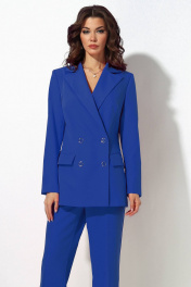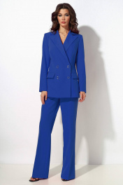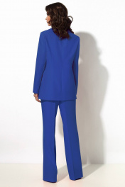Брючный комплект состоит из жакета и брюк. Жакет полуприлегающего силуэта с отложными бортами пиджачного типа. На полочке прорезной карман с клапаном. Жакет на подкладке. Брюки широкие. Верх брюк обработан обтачкой. По среднему шву сидения спинки застежка на потайную тесьму молния. Изготовлен комплект из текстильной ткани. Длина жакета по спинке 72 см, рукав 62 см. Длина брюк 108 см. Подойдет изделие на рост 164-170 см. Цвет: темный василек.