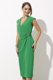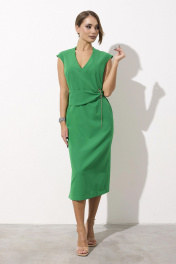 Платье женское полуприлегающего силуэта.По горловине V-образный вырез,на полочке по линии талии декоративный элемент со сборкой.С левой стороны люверсы с цепочкой.На спинке застёжка на потайную тесьму молния.С правой стороны разрез.Линия плечевого шва спущена. Длина изделия 113 см, ширина плеча 17 см.