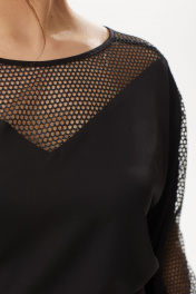 Брючный нарядный женский комплект из двух предметов: струящейся блузки со вставками сетки( по кокетке, по бокам изделия и рукавах), и свободных легких трикотажных брюк-палаццо. Вырез горловины круглый, ракав длиной 3/4, низ рукава собран на резинку, низ блузки фигурный, удлиненный по переду и спинке. Брюки длинные, прямые, с поясом на резинке и двумя карманами в боковых швах. К комплекту прилагается съемный пояс из основной ткани с бахромой по краям. Красивый летящий силуэт данного брючного комплекта выгодно подчеркнет фигуру и скроет любые недостатки. Изделие станет незаменимым для торжесивенных мероприятий. Длина изделия по спинке 71 см (+-1 см), длина рукава от горловины 57 см (+1 см). Длина брюк по боковому шву 109 (+-1см), по шаговому шву 77 (+-1см). Изделие подойдет на рост 170 см.