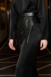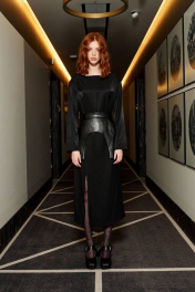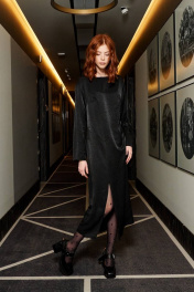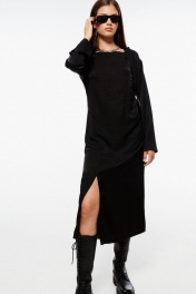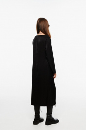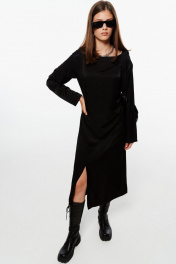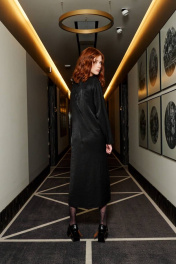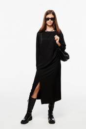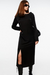 Платье, прямого кроя, с декоративными подрезами на талии и разрезом на ноге. Материал - ткань с легким блеском, небольшой рубчик