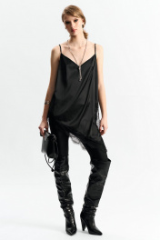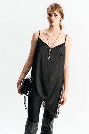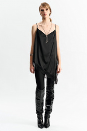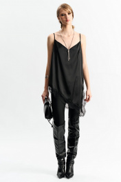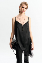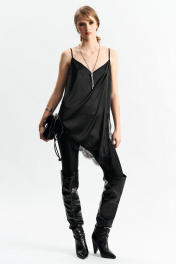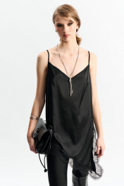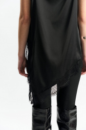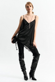 Удлиненная топ-комбинация из атласа черного цвета. Асимметричный низ и разрез по боку. По низу - французское кружево.