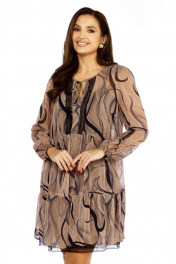 Платье женское свободного силуэта. Округлый вырез горловины, на завязках. Рукав втачной, со сборкой, по низу-на резинке. Изделие с подрезами, со сборкой. По спинке-декоративный вырез с кружевом. Нижний валан платье выполнен из сетки с кружевом. Подкладкой служит-нижнее платье на регулируемых бретелях. Длина по спинке-93см, длина рукава-63см.