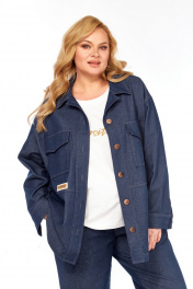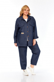 Комплект женский, состоящий из джинсовой рубашки, майки и брюк. Рубашка свободного силуэта. Перед отрезной по линии талии, с накладными карманами и отделочной планкой, застёжка на петли-пуговицы. Рукав рубашечный, по низу с застегивающимся манжетом на петли-пуговицы. Низ фигурный, обработан обтачкой. Майка прямого силуэта. Перед с вытачками и печатью. Рукав втачной, короткий. Горловина обработана бейкой. Брюки прямые. По передней части брюк-складки, идущие от кокетки, карманы. По задней части брюк-листочки, низ брюк-на резинке. Пояс на резинке, с отделочным шнуром. Длина по спинке жакета - 76 см, длина рукава - 72 см. Длина майки - 56 см, длина рукава - 20 см. Длина брюк - 100 см.