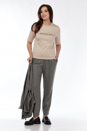 Комплект женский, состоящий из жакета, блузки и брюк, свободного кроя. Жакет с воротником-стойкой, с планкой по полочке, застёжка на петли-пуговицы, на полочке функциональные накладные карманы с клапаном , с элементом декоративной нашивки. Низ жакета отделан кулиской, которую можно присобрать. Спущенный рукав. Спинка жакета со средним швом. Блузка трикотажная, с округлым вырезом , отделана обтачкой, с печатью на полочке, с коротким рукавом. Брюки прямые. По передней части брюк-складки, идущие от кокетки, карманы. По задней части брюк-листочки, низ брюк-на резинке. Пояс на резинке, с отделочным шнуром. Длина по спинке жакета - 61 см, длина рукава - 56 см. Длина по спинке блузки - 54 см, длина рукава - 30 см. Длина брюк - 99 см.