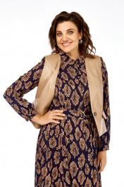 Комплект женский, состоящий из платья и жилета. Платье свободного силуэта, трикотажное, без подкладки. Рукав втачной, снизу собран на манжету, манжета застегивается на петлю и пуговицу. По талии платье отрезное, спереди до талии планка на петли и пуговицы и нагрудные вытачки, которые позволяют создать идеальную посадку по груди. Юбка-шестиклинка. Дополнительно в комплекте к платью присутствует пояс из основной ткани. Жилет полуприлегающего силуэта из эко-кожи, с накладными декоративными клапанами, застежка на одну петлю и пуговицу. Длина платья по спинке - 120 см, длина рукава - 62 см. Длина жилета по спинке - 49 см.