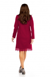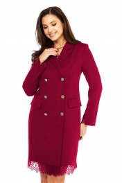 Двубортный жакет-платье, полуприлегающего силуэта, из костюмной ткани, без подкладки. Воротник-с отложными лацканами пиджачного типа, рукава – двухшовные. По переду – вытачки, прорезные карманы с клапанами и двумя листочками. Жакет имеет 6 пуговиц и одну потайную. По низу изделия и в шве рукава используется кружево, для придания романтизма классическому образу. Длина плечевого шва - 12 см, длина рукава - 61 см, длина изделия по спинке - 91 см и 97 см с кружевом.