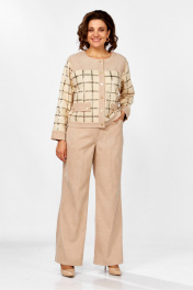 Женский комплект полуприлегающего силуэта, выполнен из штруксовой ткани и замши с принтом. Жакет выполнен из замши с принтом, застежка по переду, на планку с кнопками, горловина округлой формы, на обтачке, обтачка и планка из штрукса. Также на полочке обработаны кокетки из штрукса, также на полочке обработаны клапаны из штрукса, низ жакета обработан притачной планкой из штрукса. Спинка также с кокеткой из штрукса, рукав втачной, длинный, по низу на манжете из штрукса. Брюки выполнены из штрукса, прямого покроя, верхний срез обработан притачным поясом. Застежка по переду на молнию-пуговицу, в боковых швах карманы. Стильный комплект отличный выбор для осеннего образа! В 52р Куртка: Ширина груди- 58см, Ширина талии -56см, длина рукава- 58см, ширина рукава 23см. Брюки: Ширина бедер -56см, Ширина талии- 47см. Длина куртки 55см, длина брюк по боковому шву 106см, длина брюк по внутреннему шву 80см.