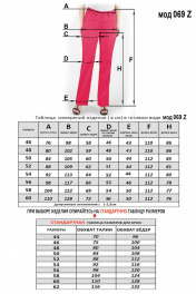 Длина брюк без пояса 108 см. Длина брюк по внутреннему (шаговому) шву Р-ры: 48 ,50- 87 см. 52,54 - 82 см. 56,58,60- 78см. Ширина низа брюк: Р-ры: 48 ,50- 42 см. 52,54 - 44см. 56,58- 48см 60- 50см