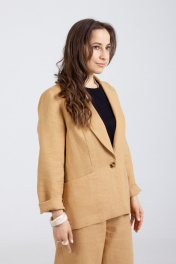 Жакет полуприлегающего силуэта без подкладки из натурального мягкого льна "с эффектом мятости" , передние части с рельефами и карманами в шве , спинка со средним швом и рельефами, застёжка на 1 петлю и пуговицу. Рукав втачной, двухшовный.