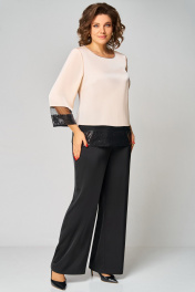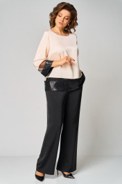 Комплект женский , двухпредметный состоящий из: туники и брюки. Туника прямого силуэта по переду прострочены нагрудные вытачки. Округлый вырез горловины , по горловине прострочен декоративный кант. Спинка со средним швом. Рукав втачной, двухшовный. Длина рукава – 20см, длина по спинке -62см.Низ рукава и туники выполнен из сетки и пайеток. Брюки прямые. Длина брюк по внутреннему шву - 77см. Брюки на поясе, по бокам резинка и косые карманы. Застёжка на тесьму-молнию и 1 пуговицу.