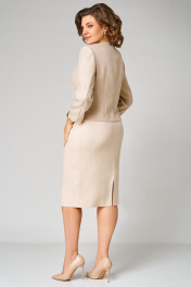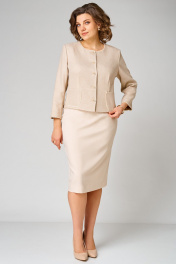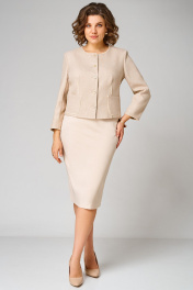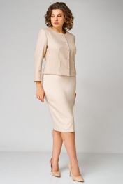 Элегантный женский комплект 2-ух предметный, состоящий из жакета и юбки. Жакет укороченный полуприлегающего силуэта, частично на подкладке по полочкам. Округлый вырез горловины. По переду накладные карманы. Спинка со средним швом и талиевыми вытачками. Застежка центральная на 5 пуговиц и петель. Рукав втачной, двухшовный длиной 7/8. По жакету настрочена декоративная тесьма: горловине, вытачке по переду, накладному карману, низу рукава. Юбка с завышенной талией заужена к низу на обтачке. Сзади разрез и застежка на потайную тесьму-молнию. Юбка на подкладке. Длина юбки 66см.