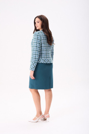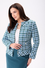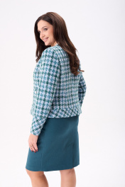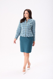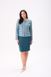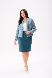 Костюм женский полуприлегающего силуэта состоит из жакета и юбки. Жакет на подкладке. По переду нагрудные вытачки, накладные фигурные карманы, застёжка на тесьму молния. Спинка с талевыми вытачками и центральным швом. По горловине и низу жакета притачная планка. Горловина круглая. Рукава двухшовные втачные на широкой манжете. Юбка, слегка зауженная к низу, без пояса, на обтачке. По переду талевые вытачки. По спинке талевые вытачки. Застёжка потайная тесьма молния расположена в центральном шве спинки. Юбка на подкладке.