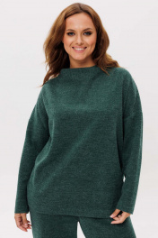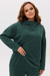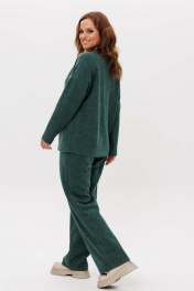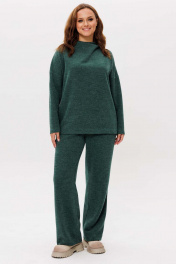 Костюм трикотажный женский состоит из джемпера и брюк. Джемпер прямого силуэта со спущенным втачным рукавом. Горловина - цельнокроеная стойка. Брюки прямого силуэта. Талия обработана притачным поясом на резинке. В боковых швах - карманы.